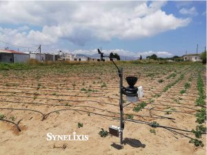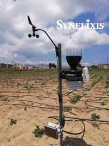 The installation consists of a SynField Head Node that drives a weather station that records real-time climatic conditions such as temperature and relative air humidity, rain height and wind speed/direction and an EC5 soil moisture sensor indicating the needs for irrigation in the crop.