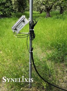 One SynField Head Node (HN) drives two METER Environment EC-5 soil moisture sensors measuring the need for irrigation, while the SynField cloud application provides advise for irrigating more than 500 olive trees in a field of more than 20.000 m2.