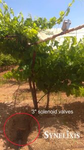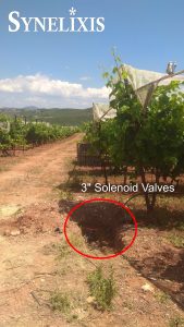 The new installation in Nea Fyteia (Kiato, Greece) consists of three SynField X1 nodes: two nodes control latching solenoid valves of 3 inches, while the third node drives two METER Environment EC-5 soil moisture sensors measuring the need for irrigation.