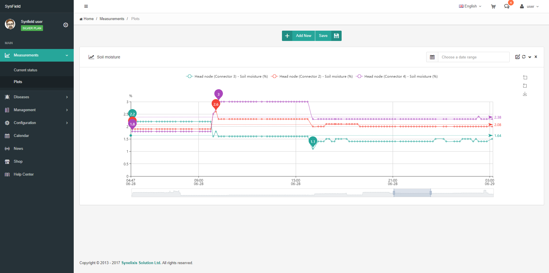 Apart from visualizing physical values (such as soil humidity, air temperature, etc.), SynField also offers specialized agriculture values such as Growing Degree Days (GDD), Evapotranspiration, etc., that are extremely helpful to farmers and agriculture scientists in order to manage fertilization and irrigation activities.