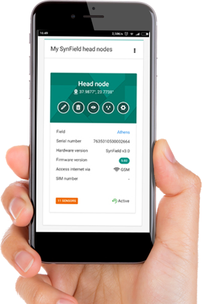 Beyond the web-based management application, SynField comes with SynControl, an Android mobile app, available free of charge at Google Play store. SynControl utilizes the Bluetooth interface of a mobile device to connect to a SynField node in the field, to retrieve, edit or update SynField node configuration, set-up the in-field network of peripheral nodes, get/set the list of sensors/actuators attached to the node, get stored log-file, reset or restart the node.